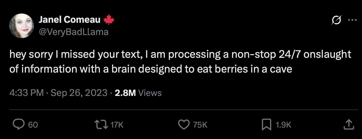 But it’s also true that our brains and nervous systems are not accustomed to handling the influx of information that firehoses at us daily. As one citizen of the internet put it: